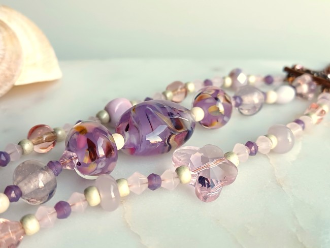 Bracelet Bohème Chic 3 rangs Violet Rose Ivoire "Lewisia", Perles Artisanales Verre Filé au Chalumeau et Perles de Verre Métal Cuivré